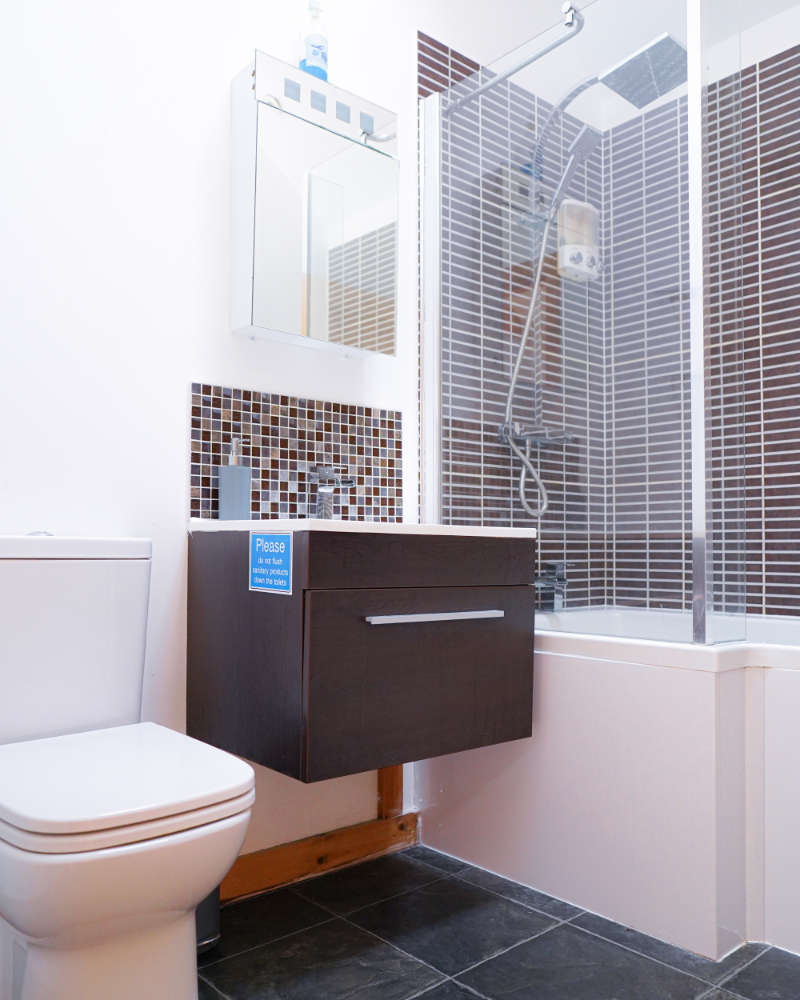 - Bathroom with shower above a full sized shower bath, sensor mirror and heated towel radiator.